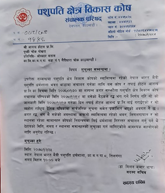 After Batas even refused to receive the letter sent by the government, Pashupati Area Development Fund had issued a public notice to vacate the Pashupati Dharamsala building run by Hotel Anand last monday.
